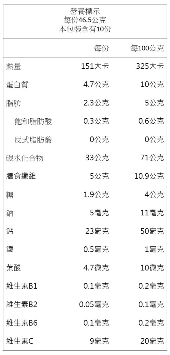 ★muesli原味麥片,天然無添加★自然水果甜,不添加額外糖類★膳食纖維與維生素B豐富★外食族最愛,省荷包無負擔★即沖即食,簡單方便【特色】muesli是最天然的原味麥片,直接將穀物簡單壓扁,加入堅果與果乾,無額外加工與添加,保留穀物與果乾的天然甜味,非常適合控制熱量的健身與瘦身朋友~天然無添加,膳食纖維與維生素B豐富,天然又健康,荷包無負擔。【成份】燕麥、小麥、大賣、葡萄乾、玉米、葵瓜子、杏仁、椰棗、維他命B。【營養標示】(插入圖片)【食用方式】◆可加入鮮奶、豆漿、優格、果汁等…食用。◆可當早餐點心或零食食用、也可當烘焙食材。◆1.5杯果麥、1.2杯低脂鮮奶、0.8杯優格、1匙檸檬汁、1杯柳橙,放置10分鐘入味。也可依個人口味額外加入蘋果、香蕉、葡萄等當季水果切片,放入冷藏1小時…。