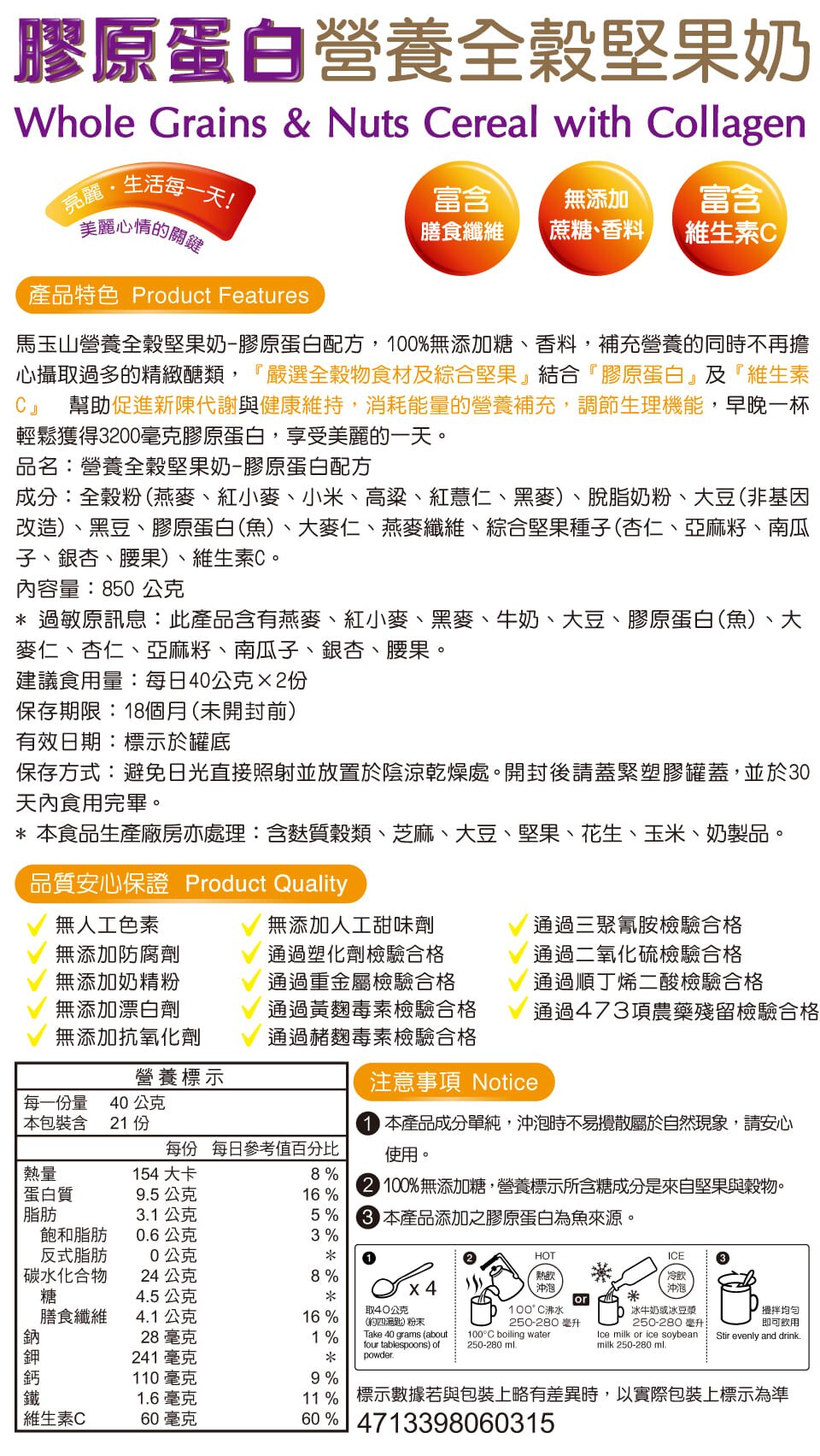馬玉山營養全穀堅果奶-膠原蛋白配方(850g) 商品圖像 商品資訊 ★原料嚴選全榖食材及綜合堅果 ★100%全穀物,含豐富膳食纖維 ★添加膠原蛋白與維生素c(膠原蛋白源自魚,非素食) ★早晚一杯,輕鬆獲得3200毫克膠原蛋白 ★小資女的營養補給 ★不添加蔗糖、香料 商品Q&A 提問者稱呼 E-mail 手機 電話 留言內容 驗證碼