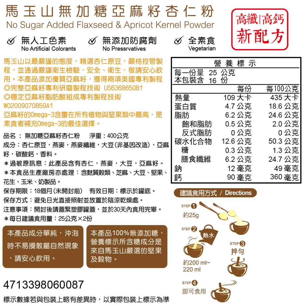 馬玉山無糖亞麻籽杏仁粉(400g) 商品圖像 商品資訊 ★高纖高鈣,即沖即飲 ★嚴選杏仁原豆與燕麥 ★添加亞麻籽,富含OMEGA-3 ★健康無糖配方 ★素食可食 商品Q&A 提問者稱呼 E-mail 手機 電話 留言內容 驗證碼