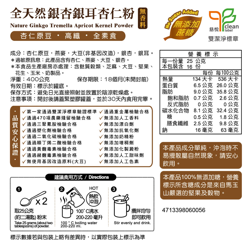 馬玉山 全天然銀杏銀耳杏仁粉(400g) 商品圖像 商品資訊 ★嚴選杏仁原豆與銀杏、銀耳 ★多種養生穀物,健康又美味 ★健康無糖配方 ★素食可食 商品Q&A 提問者稱呼 E-mail 手機 電話 留言內容 驗證碼
